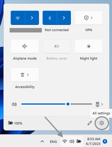 - Navigate to the Wifi icon on the bottom right side of your screen, and after you click on it, click on the Settings icon